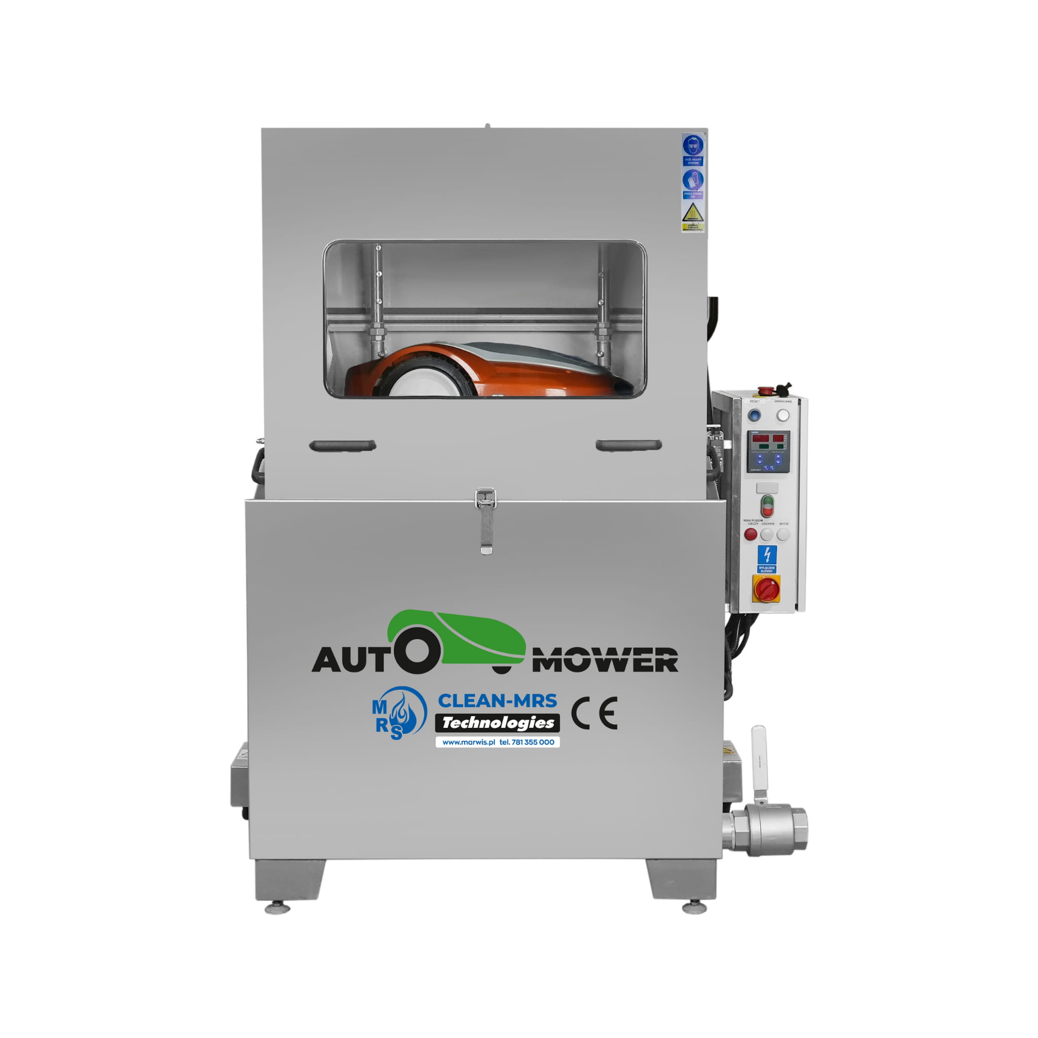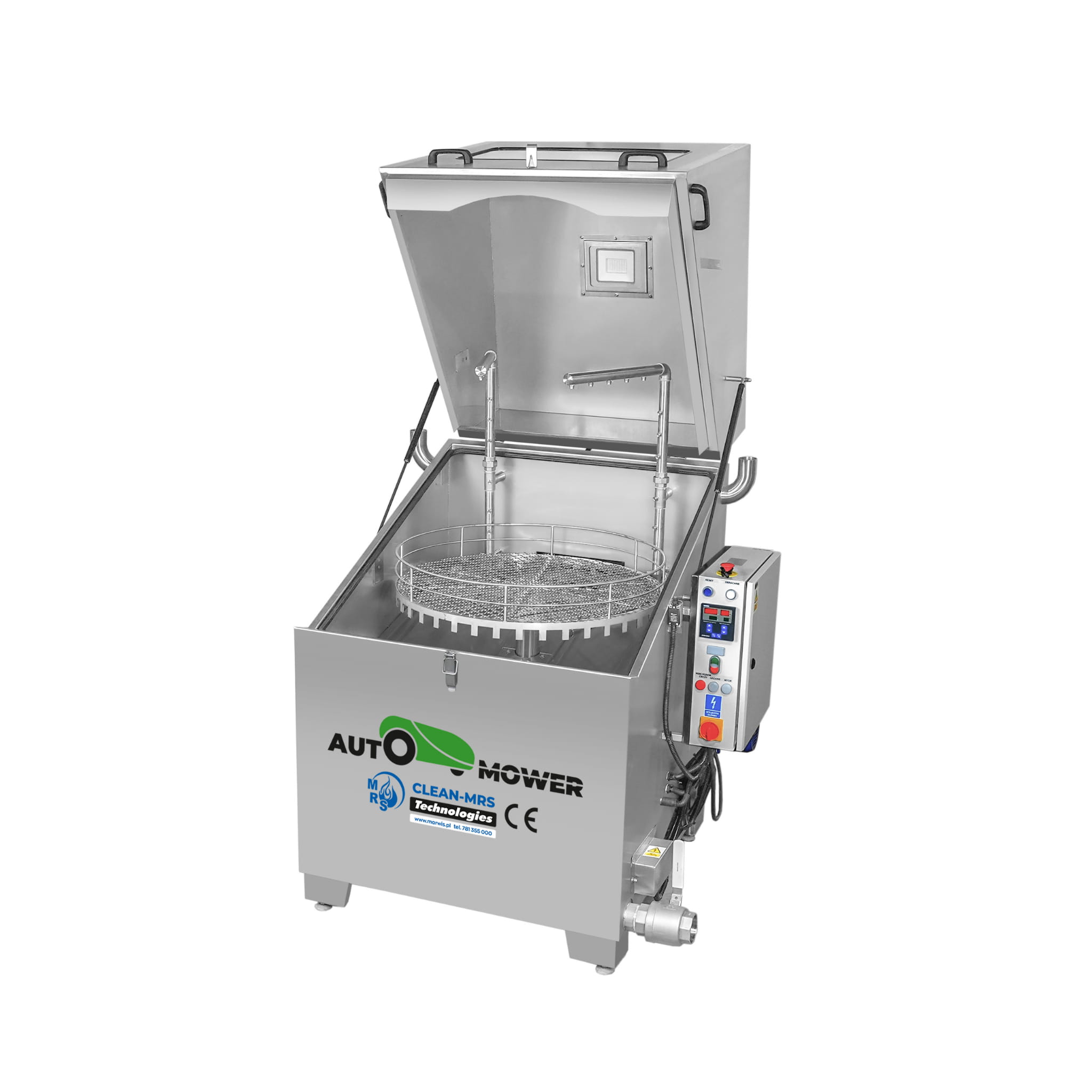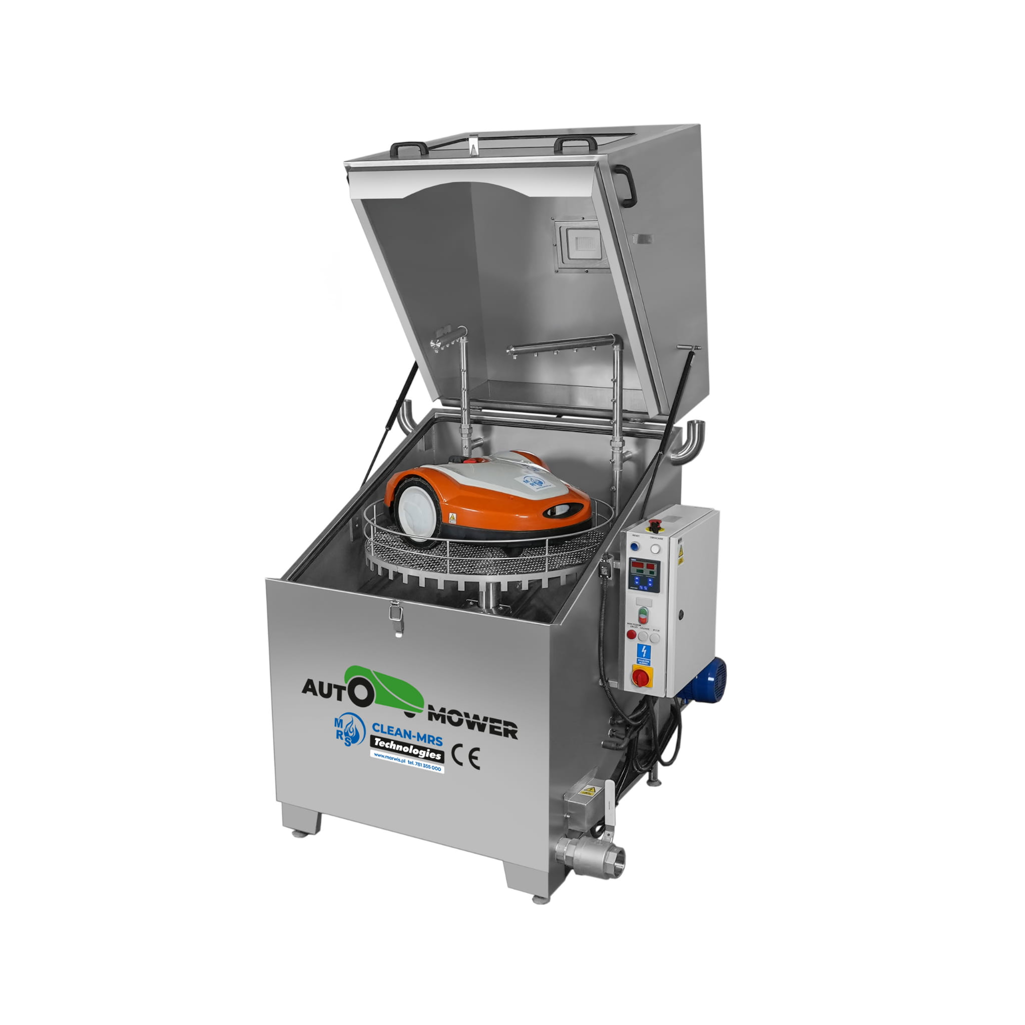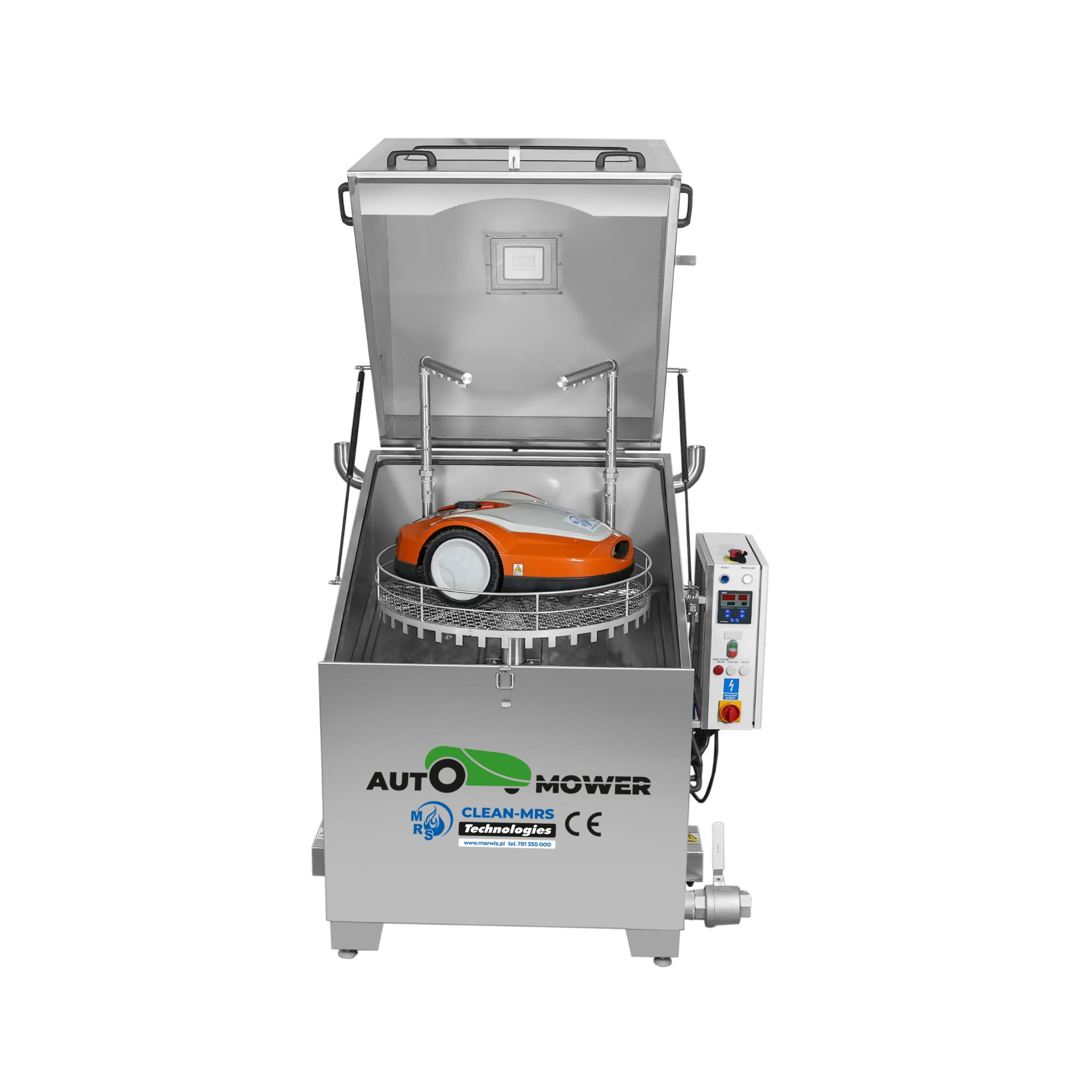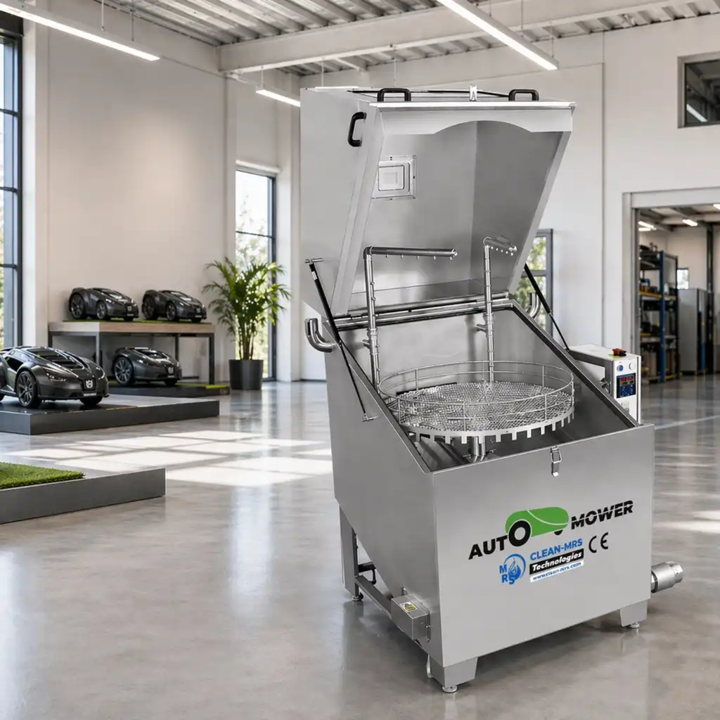 Once switched on via the main power button, the unit begins heating the cleaning bath. As soon as the set temperature is reached, the washing cycle starts automatically. A mechanically driven rotating basket and specialized spray nozzles deliver a hot cleaning solution evenly across the robotic mower, ensuring thorough and consistent cleaning of all components.